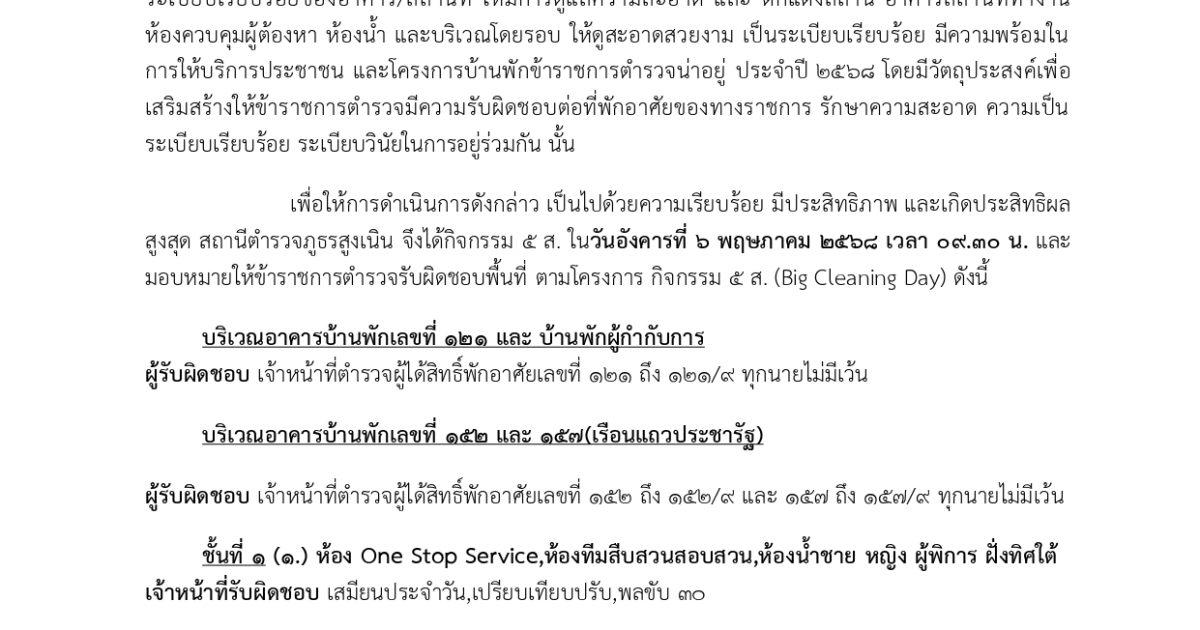 ในวันอังคารที่ 6 พ.ค.2568 เวลา 09.30 น. ให้ข้าราชการตำรวจทุกนาย ว.35 หน้า สภ.สูงเนิน ร่วมทำกิจกรรมดังกล่าวฯ ตามพื้นที่ที่ได้รับมอบหมาย