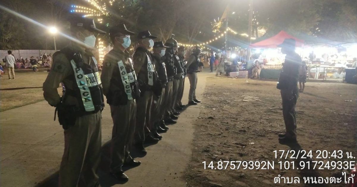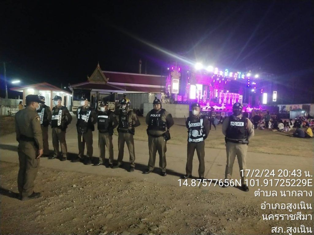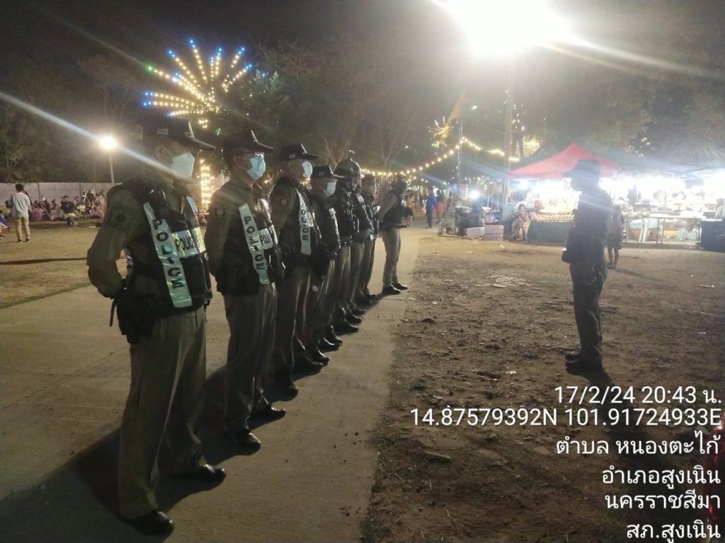 ผกก.สภ.สูงเนิน , พ.ต.ท.พิทักษ์ วงศ์อาจ รอง ผกก.ป.ฯ,พ.ต.ท.ญาณวุฒิ ชินทุมพงษ์ สวป.ฯ มอบหมายให้ ร.ต.อ.ชูศักดิ์ รัตนพันธ์ รอง สวป.ฯ พร้อมด้วย ร.ต.อ.ณรงค์เดช โถกสูงเนิน รอง สวป.ฯ ปล่อยแถว ชี้แจงภารกิจเจ้าหน้าที่รักษาความสงบเรียบร้อย งานมหรสพ วัดนาใหญ่ ( หมอลำคณะศิลปินภูไท )ต.นากลาง อ.สูงเนิน จ.นครราชสีมา