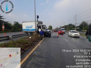 สน 3-0 พร้อม สน 6-0 จราจรเวรฯ พลขับ 3-0 รถยก ร่วมกัน เหตุ ว.40 รถ หกล้อ บรรทุกน้ำแข็ง ชนรถยนต์ปิ๊กอัพ ที่ จุดกลับรถนวนคร. มีผู้ได้บาดเจ็บ 3 ราย กูภัยนำส่ง ร.พ.สูงเนิน