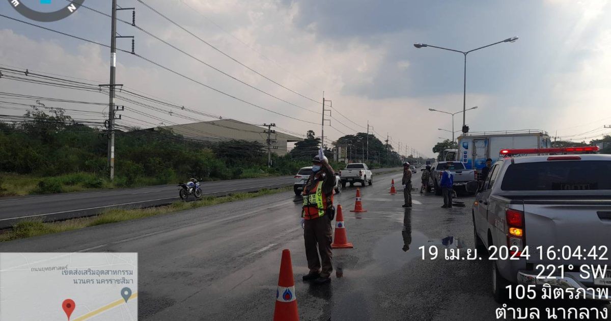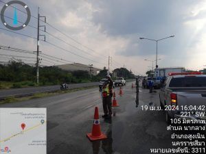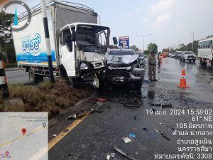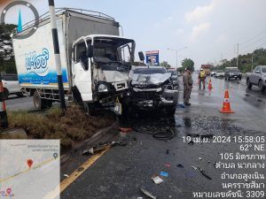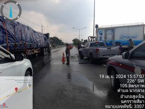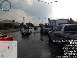 สน 3-0 พร้อม สน 6-0 จราจรเวรฯ พลขับ 3-0 รถยก ร่วมกัน เหตุ ว.40 รถ หกล้อ บรรทุกน้ำแข็ง ชนรถยนต์ปิ๊กอัพ ที่ จุดกลับรถนวนคร. มีผู้ได้บาดเจ็บ 3 ราย กูภัยนำส่ง ร.พ.สูงเนิน