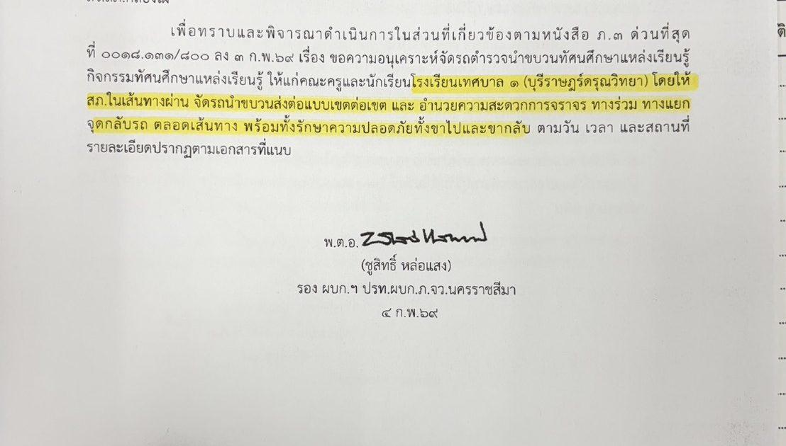 แจ้งนำขบวนคณะครูและนักเรียนโรงเรียนเทศบาล 1 (บุรีราษฎร์ดรุณวิทยา) ในวันที่ 5-6 ก.พ.69 โดยให้ สภ.ในเส้นทาง จัดรถนำขบวนเขตต่อเขต และอำนวยความสะดวกการจราจร ทางร่วม ทางเเยก จุดกลับรถ ตลอดเส้นทาง ทั้งขาไป และขากลับ รายละเอียดตามเอกสารที่เเนบ