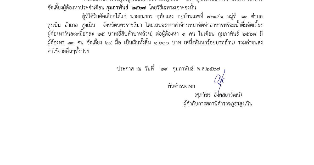 ประกาศผู้ชนะเสนอราคาจ้างเหมาทำอาหารจัดเลี้ยงผู้ต้องหาเดือน ก.พ.2567