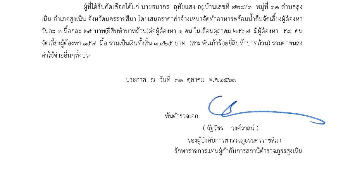 ประกาศผู้ชนะเสนอราคาจ้างเหมาทำอาหารเลี้ยงผู้ต้องหา เดือน ตุลาคม 2567