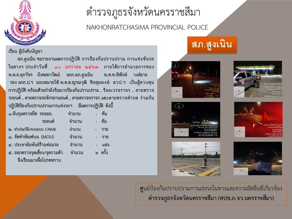 วันที่ 30 ม.ค 2567 เวลา 20.00 น. นำโดยพ.ต.ท.ญาณวุฒิ ชินทุมพงษ์ สวป.สภ.สูงเนิน,ร.ต.อ.ชูศักดิ์ รัตนพันธ์ รอง สวป.ฯ,ร.ต.อ.ณรงค์เดช โถกสูงเนิน รอง สวป.ฯได้ร่วมกันปล่อยแถวสายตรวจผลัดที่ 1 ( 20.01-08.00) ก่อนออกปฏิบัติหน้าที่ และ สายตรวจผลัดเก่า ดังนี