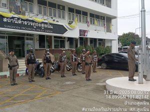 ได้เรียกแถวสายตรวจ เพื่อเคารพธงชาติพร้อมอบรมปล่อยแถวสายตรวจและชี้แจงข้อราชการ ข้อสั่งการ