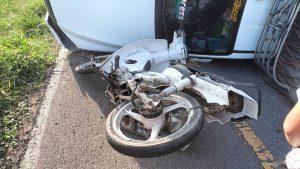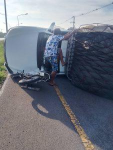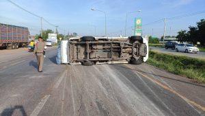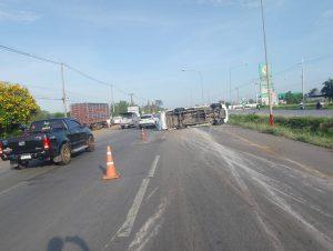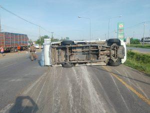 รถบรรทุกพริก ยางระเบิด พลิกตะแคงเสียหลักลื่นไหลมาชน รถจยย.ผู้ขับขี่เป็นชายได้รับบาดเจ็บ กู้ภัยนำส่ง รพ.รถกีดขวาง 1 ช่องจราจร ไม่มี ว39 จึงได้ตั้งกรวยเปิดสัญญาณไฟวับๆพร้อมรถจราจรเพื่อป้องกันอุบัติเหตุซ้ำซ้อน