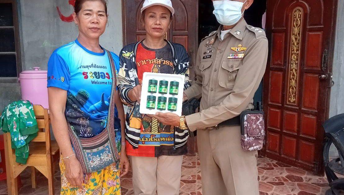 ผู้ใหญ่รำไพ ชาวดอนคูณ ผู้ใหญ่บ้านหมู่ที่ 7 บ้านทุ่งตะแบง ต.มะเกลือใหม่ และ สอบต.ชนาภา ขอมีกลาง สอบต. ม.7 บ้านทุ่งสะแบง ต.มะเกลือใหม่ ที่เห็นความสำคัญการทำงานของสายตรวจตำบลมะเกลือใหม่ ( สน.110 ) นำซุปไก่สกัดมามอบให้