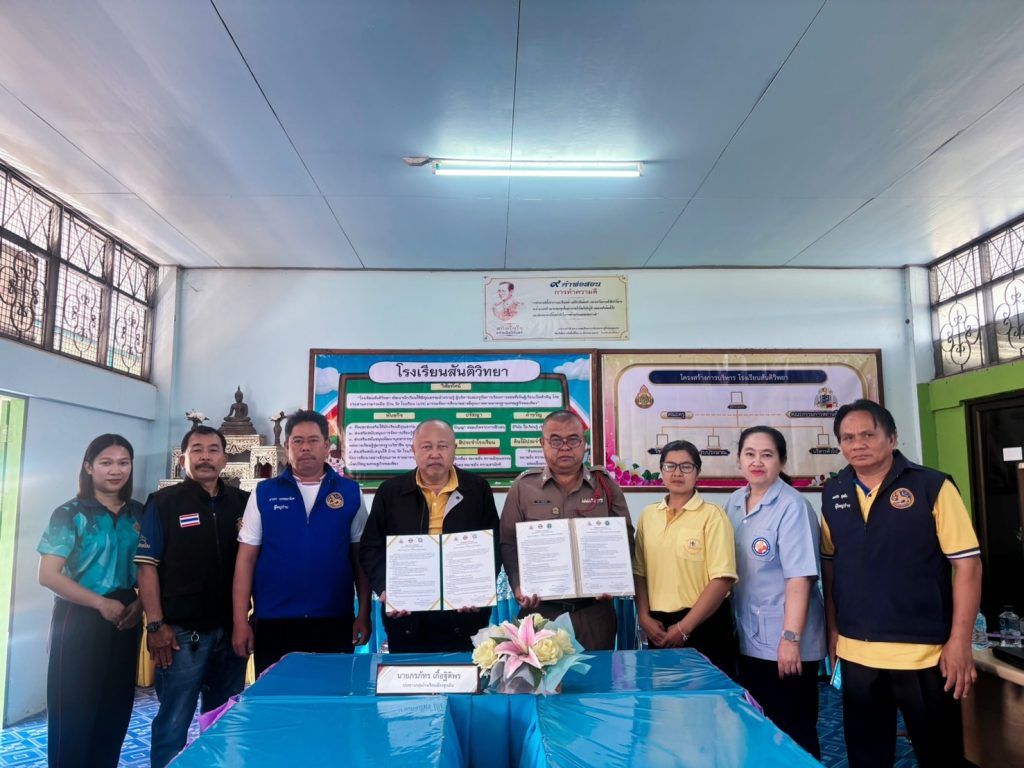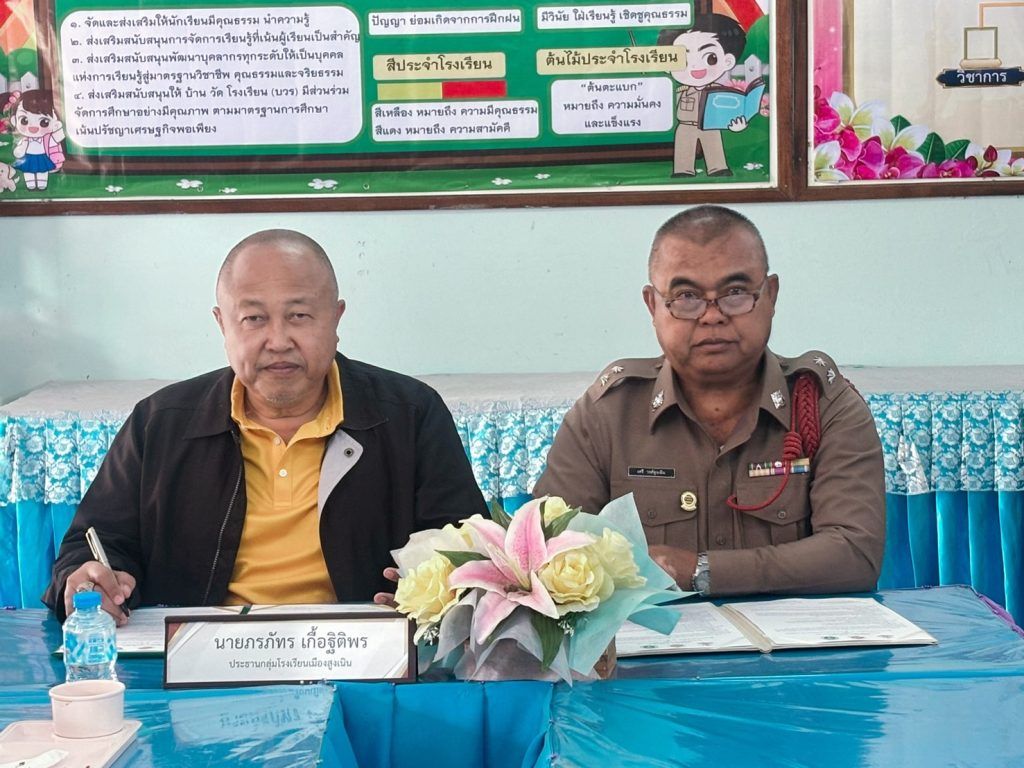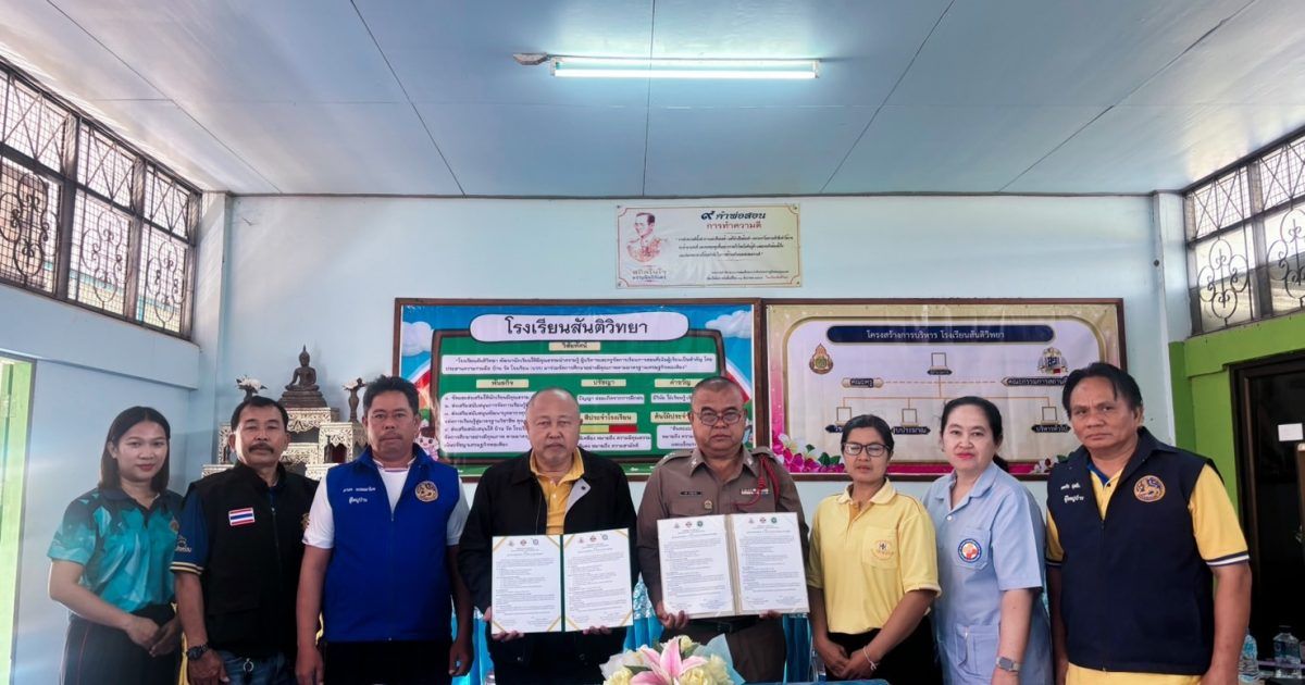 สภ.สูงเนิน ภ.จว.นครราชสีมา วันที่ 21 ก.พ.2567เวลา 09.00 น.ภายใต้การอำนวยการของ พ.ต.อ.ศุภวัชระ อังคสยาวัฒน์ ผกก.สภ.สูงเนิน,พ.ต.ท.พิทักษ์ วงศ์อาจ รอง ผกก.ป.ฯ,พ.ต.ท.ญาณวุฒิ ชินทุมพงษ์ สวป.ฯ,พ.ต.ต.ภูมิรัฐ พิสุทธิ์คุณวุธน์ สวป.(ชส.)ฯมอบหมายให้ ร.ต.ท.เสรี วงศ์สูงเนิน ร่วมพิธีลงนามบันทึกข้อตกลงลงนามร่วมมือ(MOU)สถานศึกษาสีขาวปลอดยาเสพติดและอบายมุข ณ โรงเรียนสันติวิทยา ต.บุ่งขี้เหล็ก อ.สูงเนิ