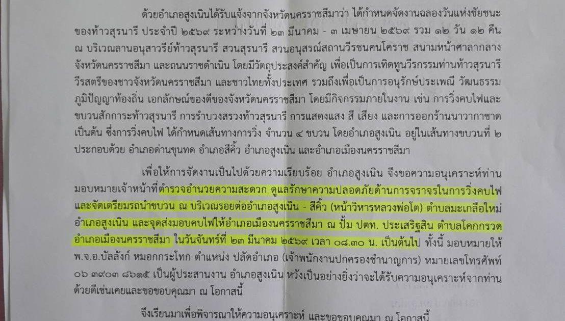 งานจราจร ขออนุญาตแจ้งคำสั่งที่ 34/2569 ลง 20 มี.ค.69 เรื่อง ภารกิจอำนวยความสะดวกด้านการจราจร จัดรถนำขบวน และ อำนวยความสะดวกทางร่วมทางแยก ขบวนวิ่งคบไฟ 4 มุมเมือง พิธีเปิดงานฉลองวันแห่งชัยชนะของท้าวสุรนารี ประจำปี 2569