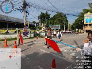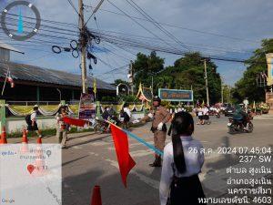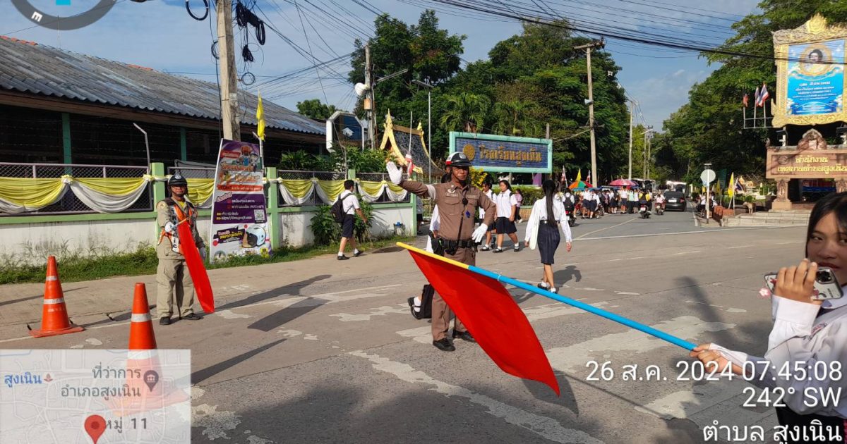 ร.ต.ต.วิเชียร แย้มสูงเนิน รอง สว.(ป)/จราจรเวรฯพร้อมด้วยคณะครูเวรฯ อาสาสมัครจราจรและนักเรียน ร.ด.โรงเรียนสูงเนิน ร่วมกัน ว.4อำนวยความสะดวกการจราจร ที่ถนนหน้าโรงเรียนสูงเนิน