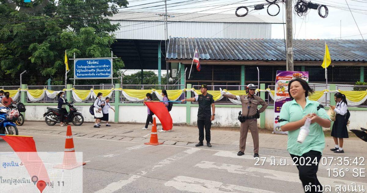 ร.ต.ต.วิเชียร แย้มสูงเนิน รอง สว.(ป)/ จราจรเวรฯพร้อมด้วยคณะครูเวรฯ อาสาสมัครจราจรและนักเรียน ร.ด. โรงเรียนสูงเนิน ร่วมกัน ว.4 อำนวยความสะดวกการจราจร ที่ถนนหน้าโรงเรียนสูงเนินขณะปฎิบัติหน้าที่เหตุการณ์ปกติ