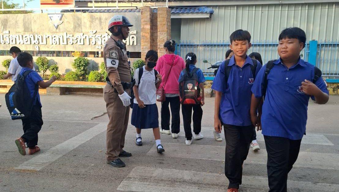 สายตรวจจราจรเวรฯ ว.4 อำนวยความสะดวกการจราจร ที่ถนนหน้าโรงเรียนอนุบาลประชารัฐสามัคคี ขณะปฏิบัติหน้าที่เหตุการณ์ปกติ