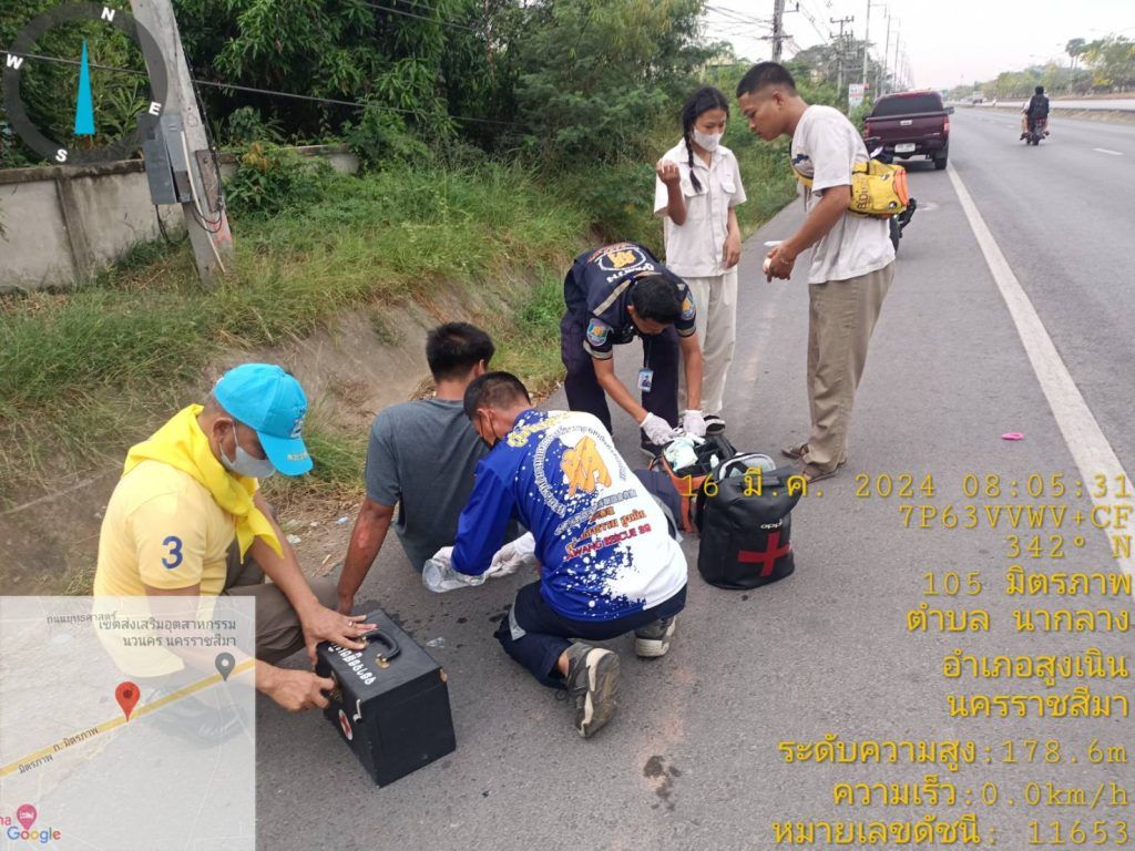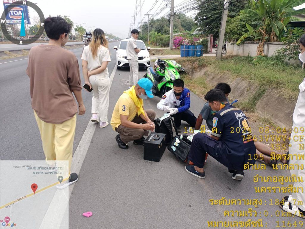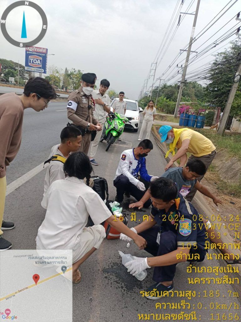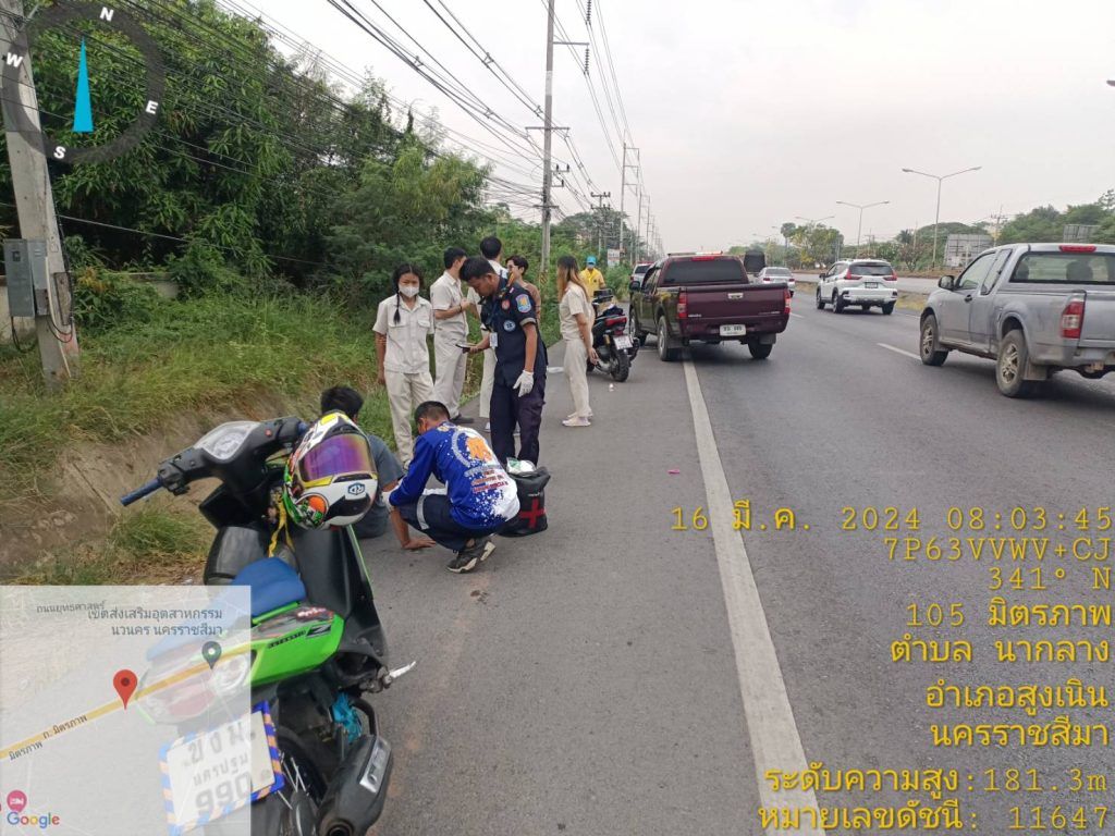 สภ.สูงเนิน ภ.จว.นม.วันที่ 9 มี.ค. 2567 เวลาประมาณ 08.00 น. ร.ต.ท.สมบัติ อัคเสริญ รอง สว.(ป.)สภ.สูงเนิน สน.60 ชุดจราจร อำนวยความสะดวกการจราจร เหตุ ว.40 ถนนมิตรภาพ หน้าเขตอุตสาหกรรมนวนคร ช่องทางคู่ขนานขาเข้า กทม.เบื้องต้นเป็นรถ จยย. กับ จยย. มีผู้บาดเจ็บ 2 ราย สว่างแสงธรรมนำส่ง รพ.สูงเนิน และได้ประสานในส่วนที่เกี่ยวข้องในการปฏิบัติหน้าที่ครั้งนี้ได้มี ด.ต.ทินกร ขอแจ้งกลาง ผบ.หมู่ (ป) สภ.สูงเนิน ว.4 เวรจราจร ( แต่งกายชุดจิตอาสา ) ทำหน้าทึ่ปฐมพยาบาลเบื้องต้น การจราจร ไม่ติดขัดสามารถเดินรถได้ได้อย่างต่อเนื่อง