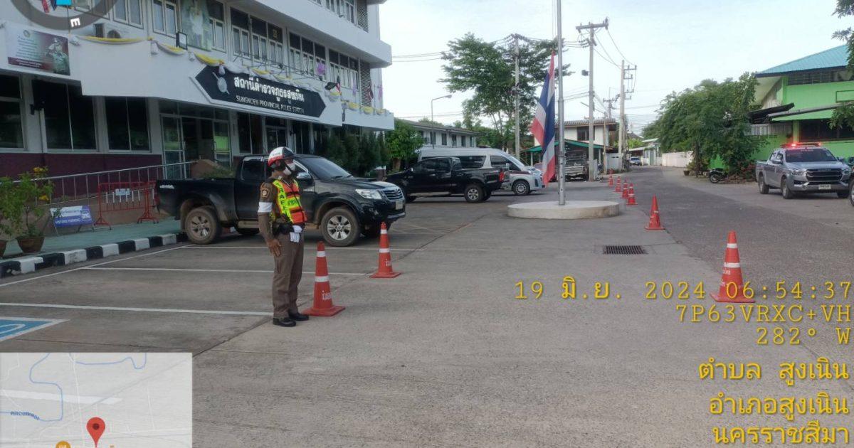 สภ.สูงเนิน วันนี้ 19 มิ.ย. 67 เวลา 06:50 น (สน.60 ) พร้อมชุดจราจร วางกรวยยางหน้า สภ.สูงเนินเตรียมพื้นที่ต้อนรับการตรวจเยี่ยมของ รอง ผบก.ภ.จว.นม.