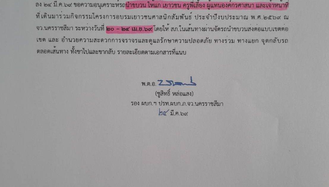 งานจราจร ขออนุญาตแจ้งคำสั่งที่ 53/2569 ลง 20 เม.ย.69 เรื่อง อำนวยความสะดวกด้านการจราจรและนำขบวน คณะเยาวชน ครูพี่เลี้ยง ผู้แทนองค์กรศาสนา จะเดินทางมาร่วมกิจกรรมโครงการอบรมเยาวชนศาสนิกสัมพันธ์ ในพื้นที่จังหวัดนครราชสีมา ระหว่างวันที่ 20 – 24 เม.ย.2569