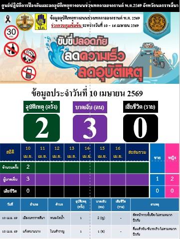ศูนย์ปฏิบัติการป้องกันและลดอุบัติเหตุทางถนนช่วงเทศกาลสงกรานต์ พ.ศ.2569 อำเภอสูงเนิน ขอรายงานสถิติการเกิดอุบัติเหตุทางถนนในพื้นที่ ช่วงควบคุมเข้มข้น ระหว่างวันที่ 10 – 16 เมษายน 2569 (รวม 7 วัน) ดังนี้