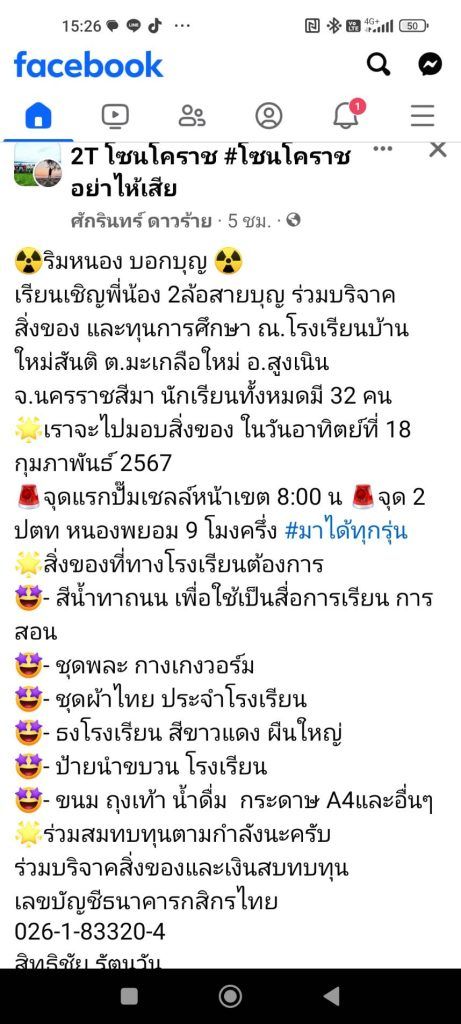 ด้วย ภ.จว.นม. ตรวจสอบพบว่าเพจ Facebook ของนายศักรินทร์ ดาวร้าย 2T โซน โคราช#โซนโคราชอย่าให้เสีย เชิญ ชวนพี่น้อง2ล้อสายบุญร่วมบริจาค สิ่งของและทุนการศึกษาโรงเรียนวัดใหม่สันติ ตำบลมะเกลือใหม่อำเภอสูงเนินจังหวัดนครราชสีมา จากการตรวจสอบพบว่าเป็นการเดินทางด้วยรถจักรยานยนต์สายแว๊นจึงให้ทุกสภ. ตรวจสอบและสกัดกั้นการขับขี่รถในลักษณะกีดขวางการจราจรหรือทำให้ประชาชนเดือดร้อนหรือใช้รถจักรยานยนต์ในลักษณะผิดกฎหมายเช่นไม่ติดแผ่นป้าย/ดัดแปลงสภาพรถ/เสียงดัง ตามข้อหาที่ปรากฏ