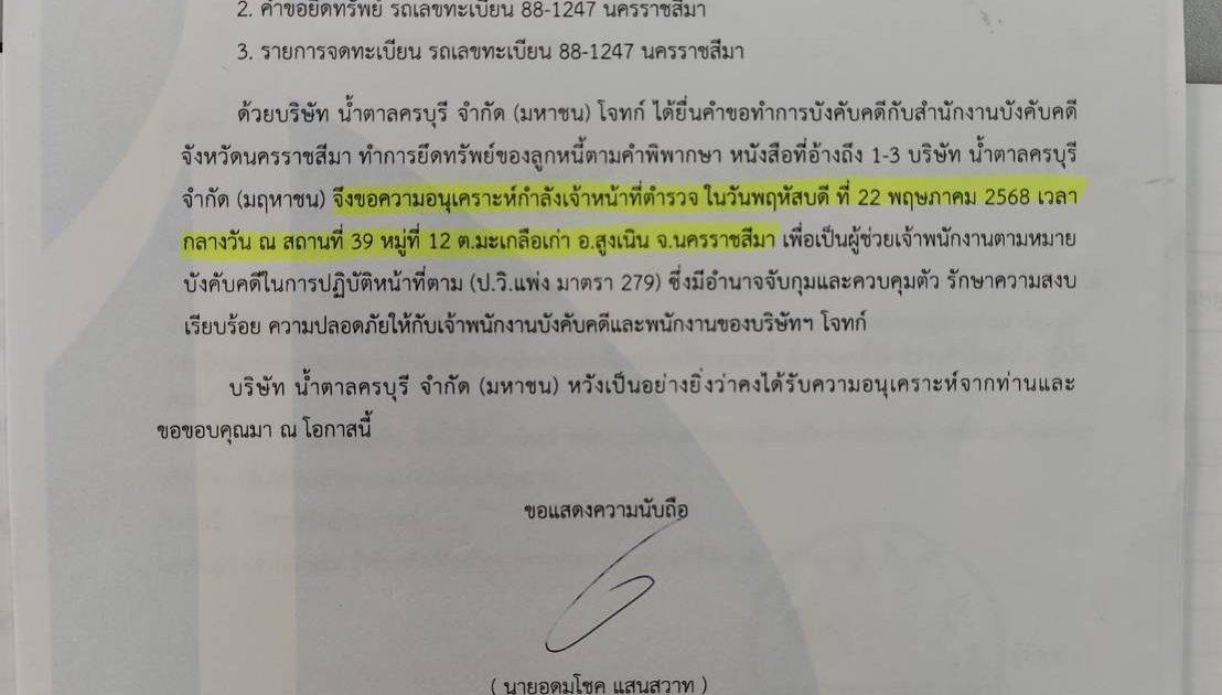 -ด้วยได้รับหนังสือ จาก บริษัท น้ำตาลครบุรี จำกัด(มหาชน) เรื่อง ขอความอนุเคราะห์เจ้าหน้าที่ตำรวจเพื่อรักษาความปลอดภัยให้กับเจ้าพนักงานบังคับคดี และพนักงานของบริษัท เพื่อทำการยึดทรัพย์ของลูกหนี้ตามคำพิพากษาศาลจังหวัดสีคิ้ว ในวันนี้ 22 พ.ค.68 เวลากลางวัน ณ สถานที่ 39 หมู่ที่ 12 ต.มะเกลือเก่า อ.สูงเนิน