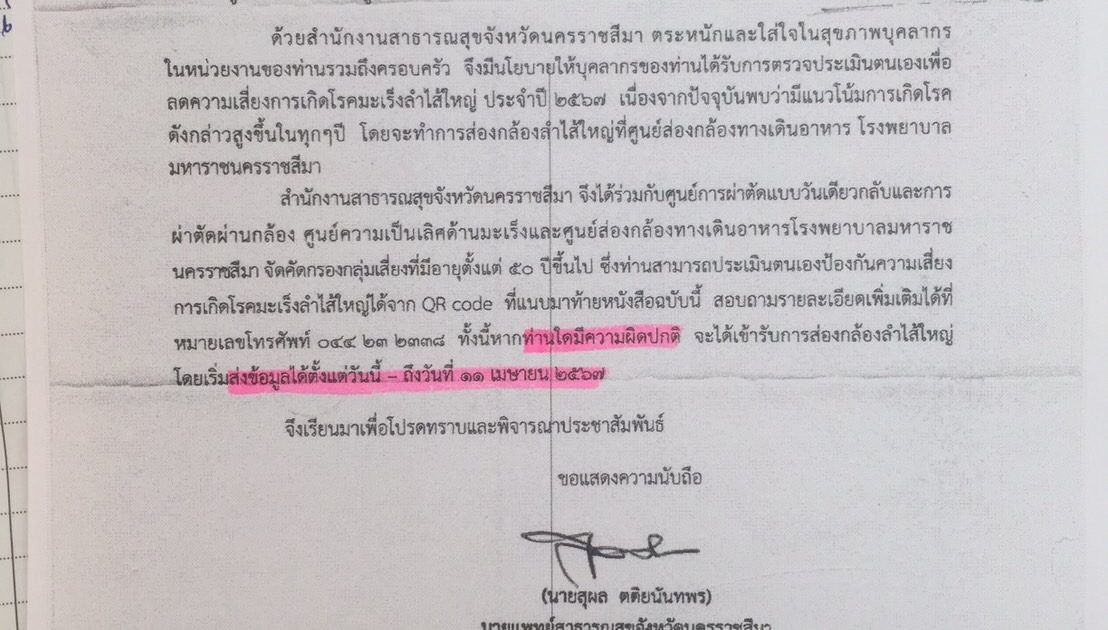 -ด้วยได้รับหนังสือจาก ภ.จว.ฯ เรื่อง ประชาสัมพันธ์การตรวจส่องกล้องมะเร็งลำไส้ใหญ่ในกลุ่มเสี่ยง