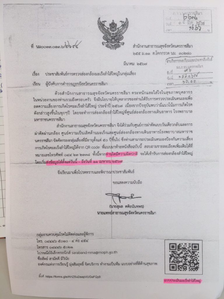 -โดย รพ.มหาราชนครราชสีมา ได้จัดคัดกรองกลุ่มเสี่ยงที่มีอายุตั้งแต่ 50 ปีขึ้นไป สามารถประเมินตนเองเพื่อป้องกันความเสี่ยงการเกิดโรคดังกล่าวได้จาก QR Code ที่แนบ