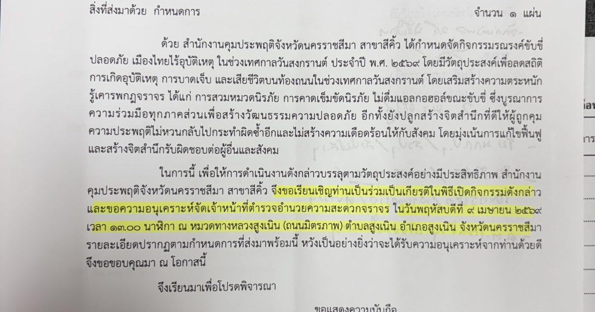 – กิจกรรมรณรงค์ขับขี่ปลอดภัย ฯ ในวันพฤหัสบดีที่ 9 เมษายน 2569 เวลา 13.00 น. ณ หมวดทางหลวงสูงเนิน (ถนนมิตรภาพ) ตำบลสูงเนิน อำเภอสูงเนิน จังหวัดนครราชสีมา