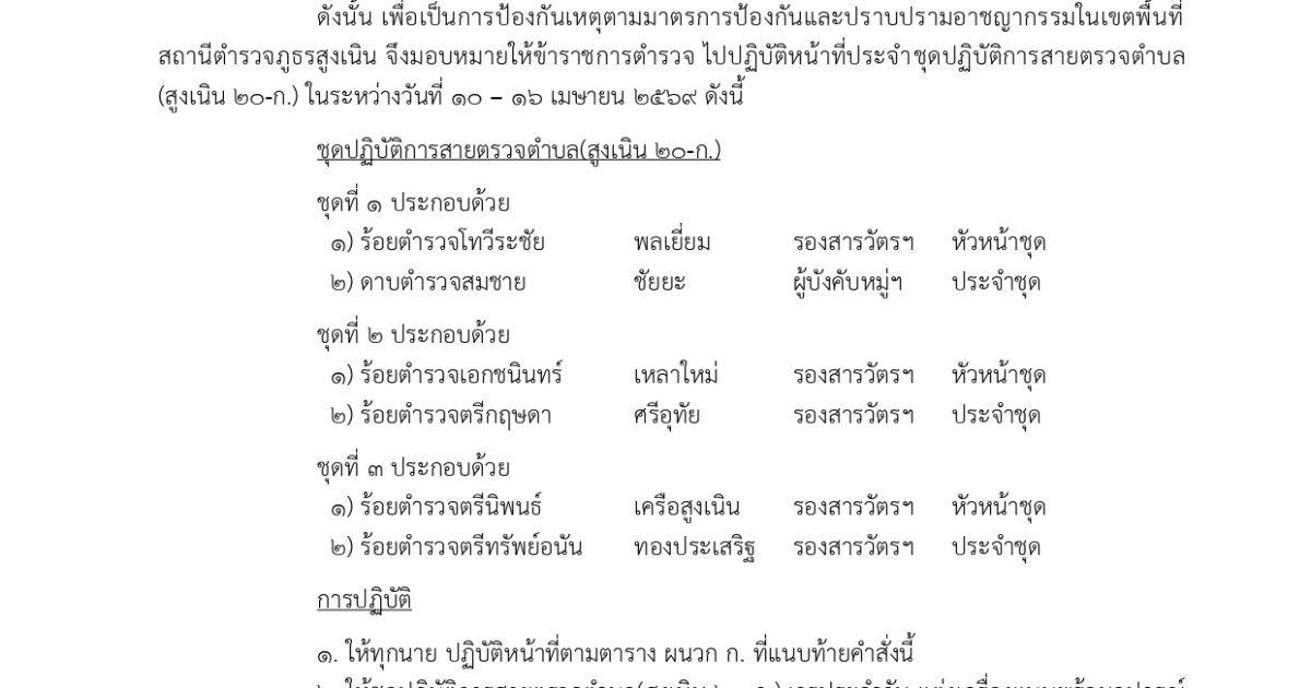 แจ้งคำสั่งที่ 44/2569 เรื่อง ให้ข้าราชการตำรวจปฏิบัติหน้าที่ ชุดปฏิบัติการสายตรวจตำบล(สน.20-ก.) วันที่ 10 – 16 เม.ย. 69