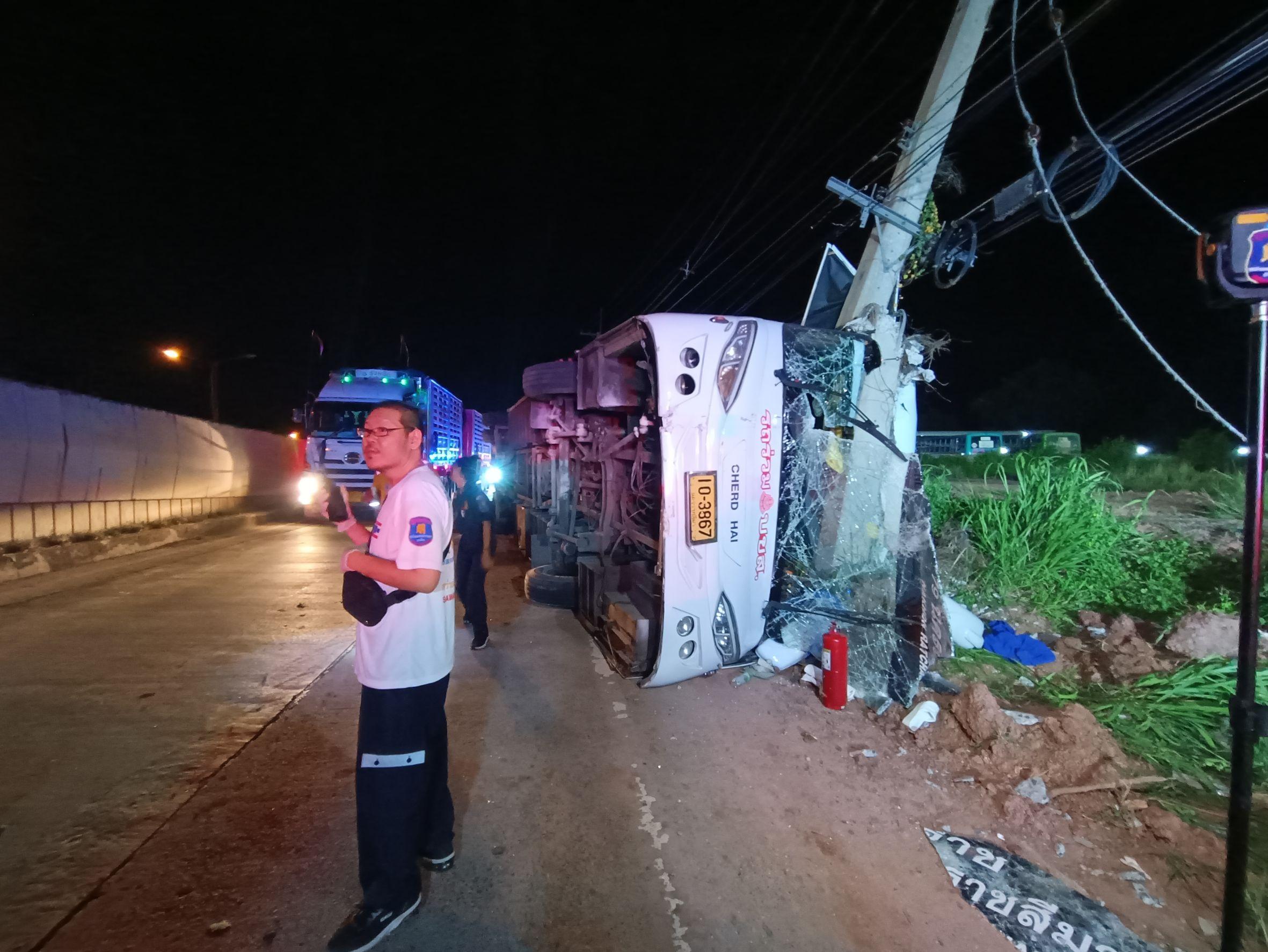 14 ก.ค.67 เวลาประมาณ22.05น. สน.60 ตรวจสอบเหตุ ว.40 รถทัวร์โดยสาร เสียหลักชนเสาไฟฟ้า มีผู้บาดเจ็บปานก
