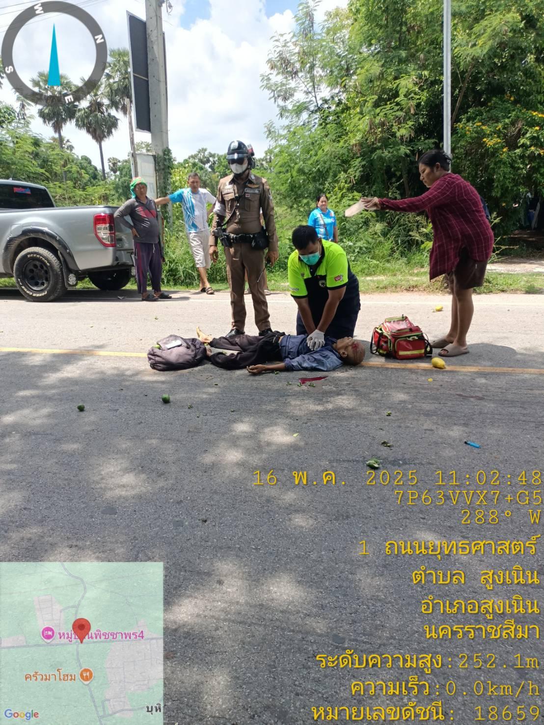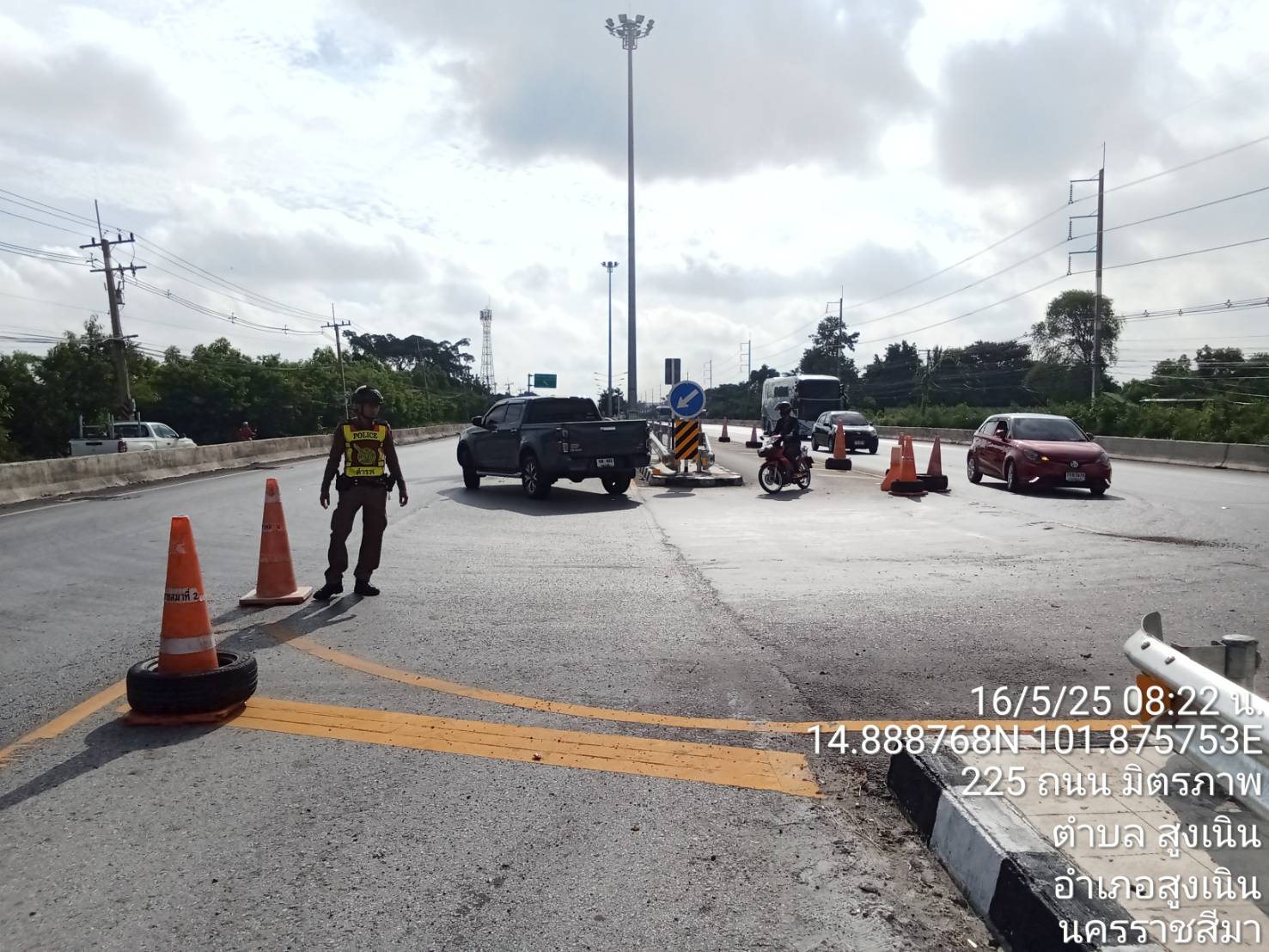 สถานีตำรวจภูธรสูงเนิน ขอรายงานถนนมิตรภาพจุดสะพานลอยหน้าบริษัทแหลมทอง กม.116+500 ในวันที่ 16 พฤษภาคม