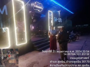 พ.ต.อ.ศุภวัชร อังคสยาวัฒน์ ผกก.สภ.สูงเนิน พ.ต.ท.พิทักษ์ วงศ์อาจ รอง ผกก.ป.สภ.สูงเนิน มอบหมายให้ พ.ต.ท.ญาณวุฒิ ชินทุมพงษ์สวป.สภ.สูงเนิน พร้อมด้วยร้อยเวร 20 สายตรวจรถยนต์ ออกตรวจสถานประกอบการร้านอาหารและเครื่องดื่ม สถานประกอบกิจการคล้ายสถานบริการ และสถานบริการ ภายเขตพื้นที่รับผิดชอบ ดังนี้