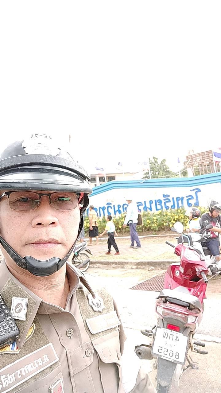 ร.ต.ต.วิเชียร แย้มสูงเนิน รอง สว.(ป) จราจรเวรฯ อำนวยความสะดวกการจราจร ที่ถนนหน้าโรงเรียนสูงเนิน