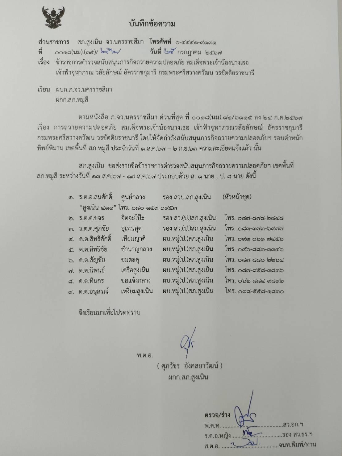 เรียน ผู้บังคับบัญชา ขออนุญาตแจ้งลูกข่าย สภ.สูงเนิน ที่สนับสนุนถปภ.ตำหนักทิพย์พิมาน ระหว่างวันที่ 13