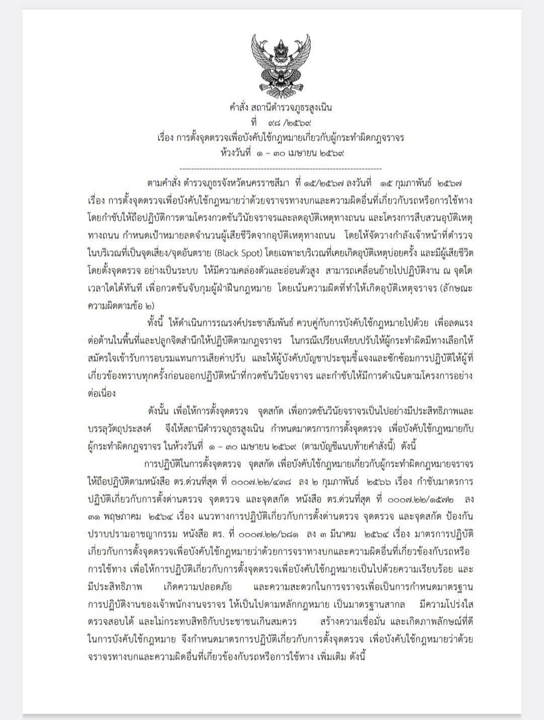 งานจราจรสภ.สูงเนิน ขอแจ้งแผนการตั้งจุดตรวจกวดขันวินัยจราจร ประจำเดือน เมษายน 2569 รายละเอียดตามเอกส